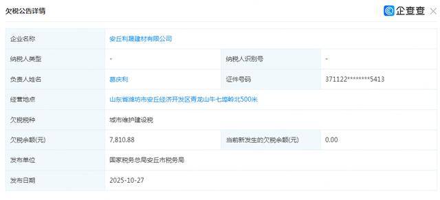 此外,国度税务总局安丘市税务局于2025年10月27日发布欠税通知布告,安丘利晟建材无限公司欠缴城市扶植税7,810。88元,当前新发生的欠税余额为0元。