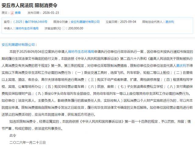 因未履行生效法令文书确定的给付权利,安丘市于2026年1月23日发布消费令(案号:(2025)鲁0784执3466号),对安丘利晟建材无限公司及代表人葛庆利采纳高消费办法。